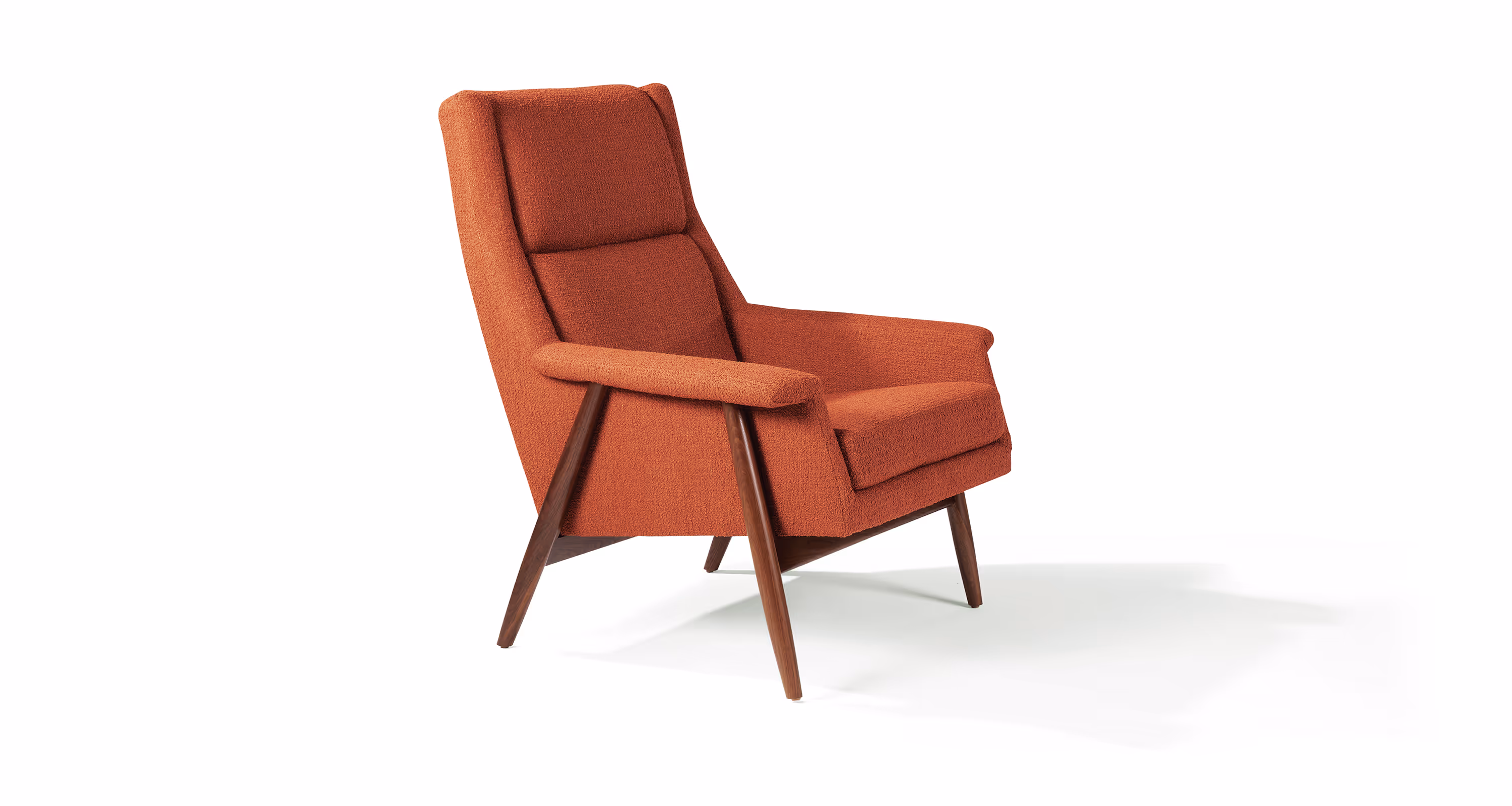 Designed by Milo Baughman in 1959, our Laid Back lounge chair is a midcentury modern classic. Influenced by Scandinavian home furnishings, Baughman designed the Laid Back chair and ottoman for sheltering comfort. A lithe and tapered walnut base supports this supremely comfortable lounge chair. High-backed and deep-seated, with flared arms that roll into understated wings, it offers a relaxed modern take on the traditional wing chair. Select any of our in-house curated fabrics or leathers for upholstery. Walnut frame available in natural walnut, black walnut or gray walnut finish.